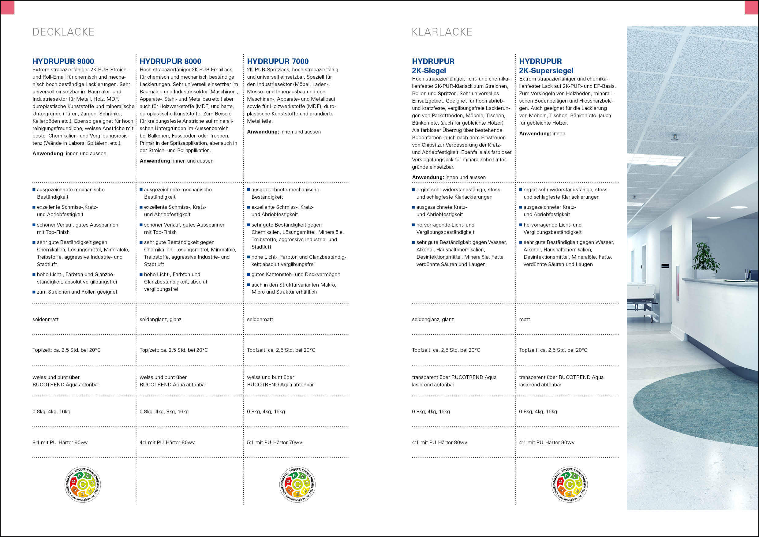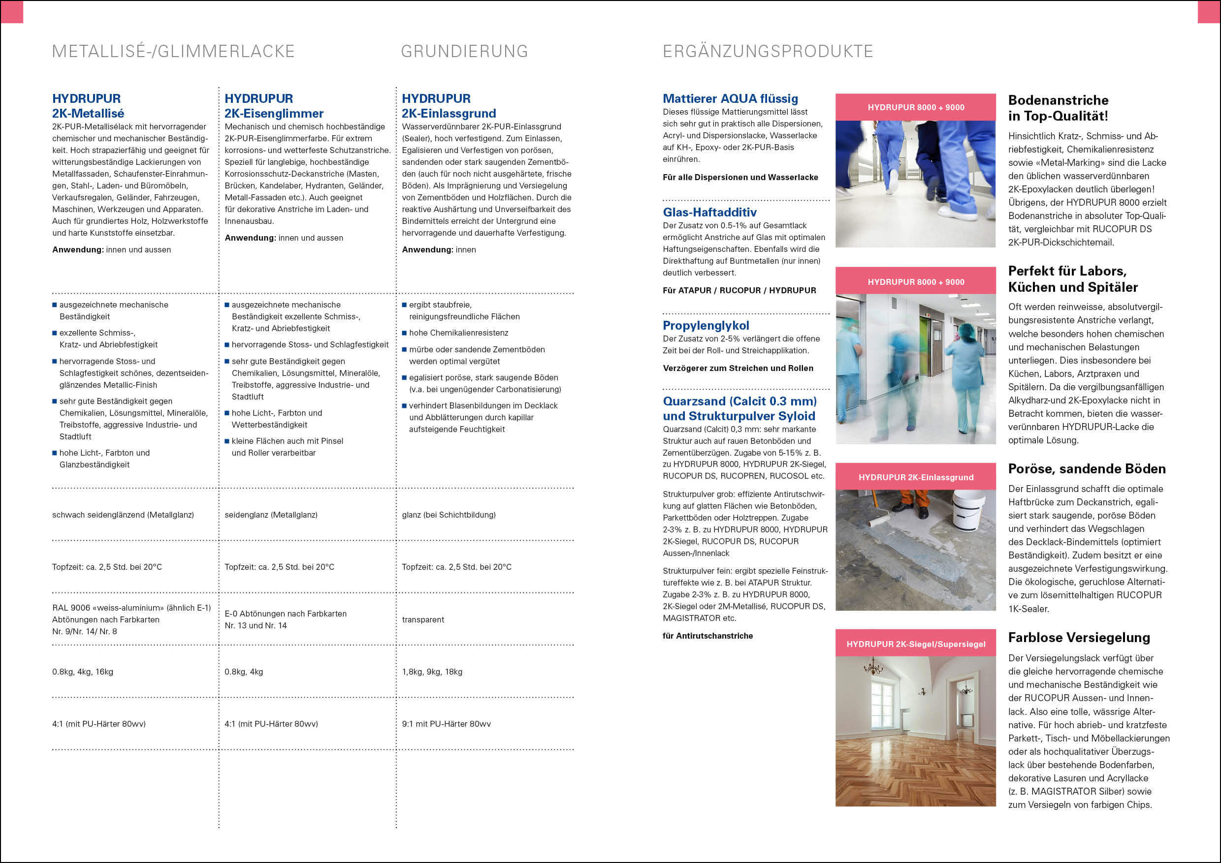 Technische Daten und Eigenschaften der Produkte in übersichtlichen B2B-Borschüren zusammenfassen. Das umfassende Sortiment an Lacken und Farben für Fachhandel anschaulich und transparent machen.